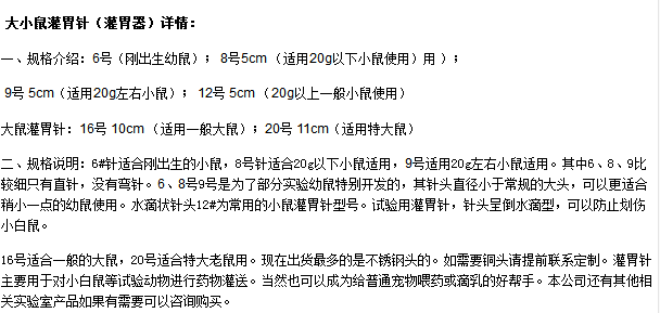 我公司是专业的灌胃针(器)制作供应商,生产方直接销售。灌胃针型号齐全,几乎含盖所有试验用途。